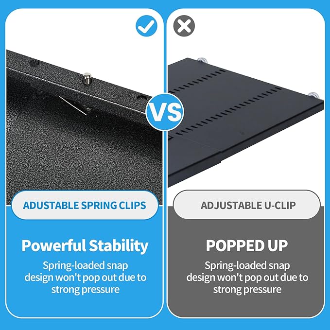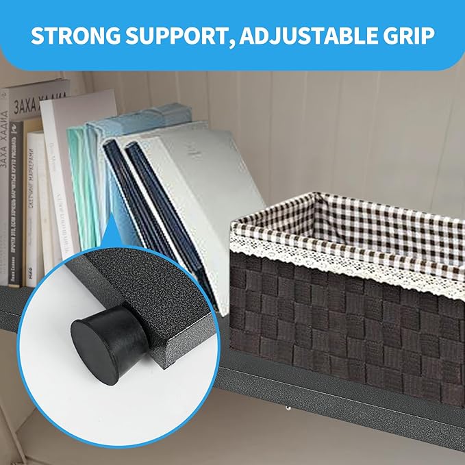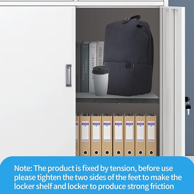- UNIVERSAL DESIGN: Tool-less installation fits most standard size metal lockers. Adjust the spring-loaded clips to bring the locker shelf to the proper width, then rotate the built-in rubber non-slip feet on both sides for fine-tuning. Secure it with the tension of the locker shelf, it's that simple!