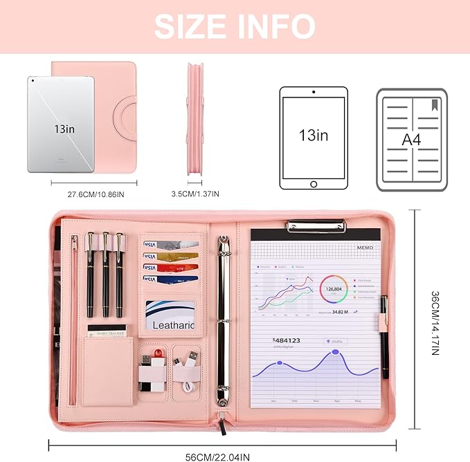- ORGANIZED FOR EFFICIENCY AND LARGE STORAGE - This padfolio features a 13-inch tablet compartment, a phone pocket, multiple card slots, Ample storage space to fulfill all your needs, Keeping your belongings organized