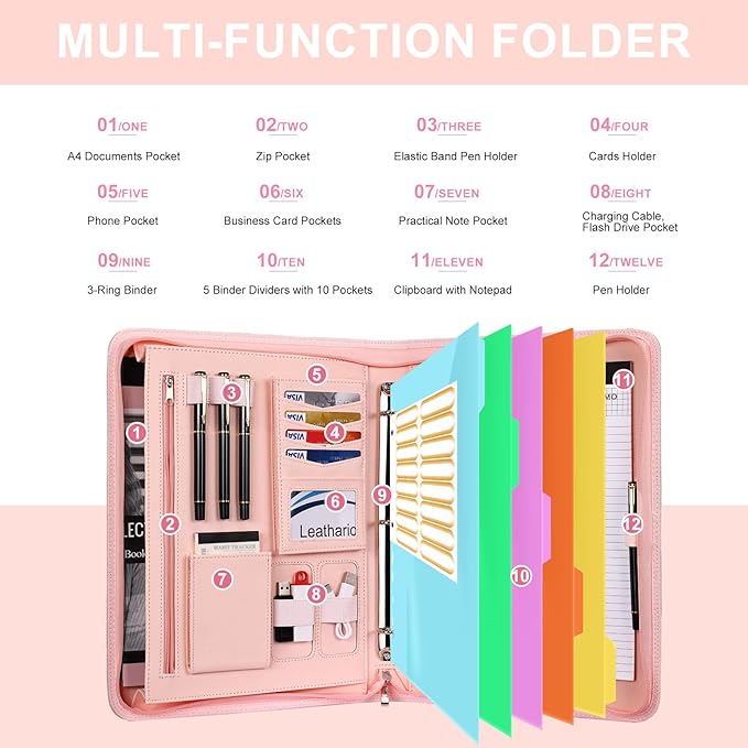 Leathario 3-Ring Portfolio Binder, Includes 5 Folder Index Dividers, 13 Inch Tablets Organizer with Handle, Vegan Leather A4 Padfolio, Multi-Pocket Notepad Business Planner Professional Document