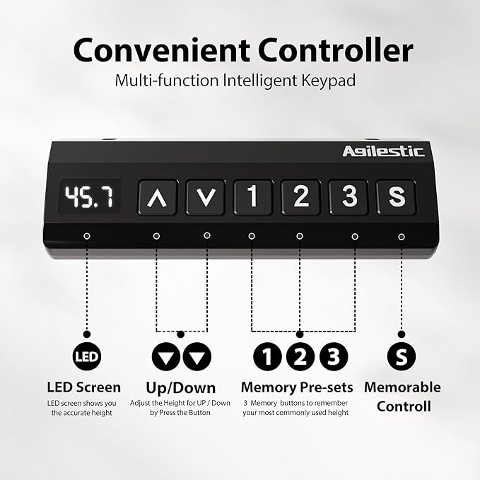 - 【Electric Adjustable Height】Agilestic's L-shaped standing desk features 6 control buttons plus 3 preset memory buttons, allowing you to adjust the height from 27.8" to 45.9". Enjoy versatile height settings for both standing and sitting tasks.