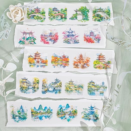 - Elegant Garden Courtyard Designs: This PET tape set includes six rolls featuring beautifully illustrated garden scenery with pre-cut designs for easy peeling and application. Capturing peaceful courtyards, ancient pavilions, and vibrant nature scenes, it's ideal for scrapbooking, journaling, and DIY crafts