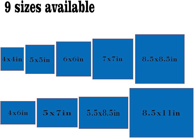 - 9 SIZES: 4*6 in, 5*7 in, 5.5 * 8.5 in, 8.5 * 11 in, 4*4 in , 5*5 in, 6*6in ,7*7in ,8.5*8.5 in.
