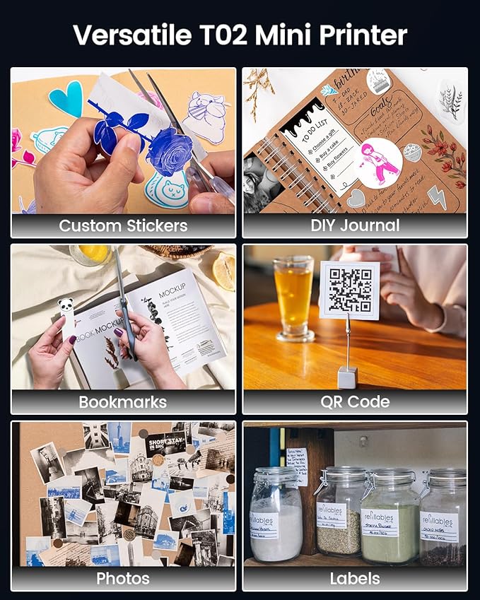 - Instant Monochrome Mini Photo Printer: T02 is not only a sticker printer, but also a thermal photo printer. Enjoy to print your photos and pictures anywhere and anytime with this mini sticker maker machine