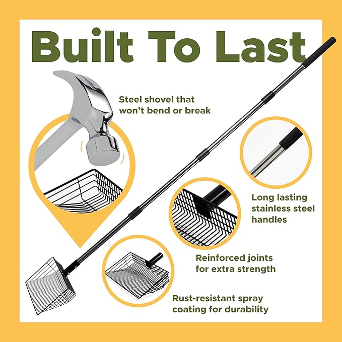 - Heavy-duty & Rust Resistant: Reinforced, laser-welded steel head and rust-resistant coating with a stainless-steel handle ensures that your chicken poop scooper lasts for a long time