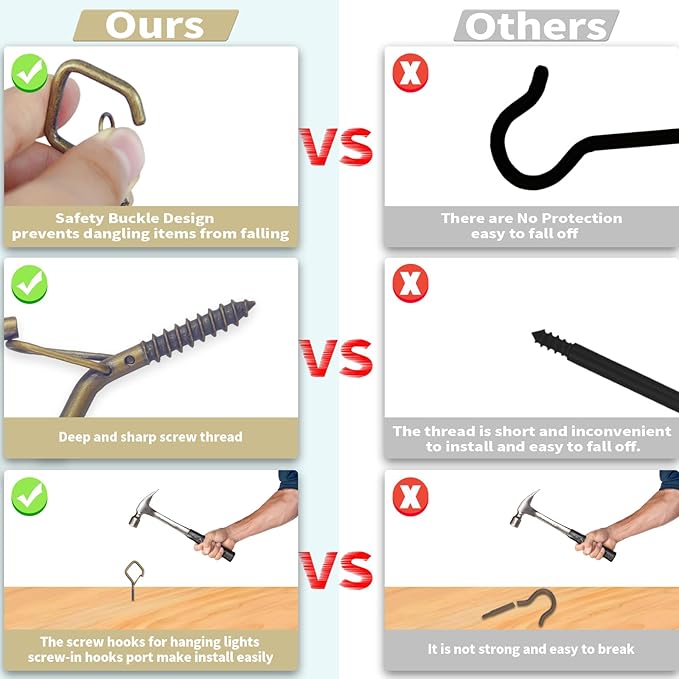 - 🔧【Easy Screw-In Installation】 Simply twist into wood, ceilings, beams, fences, or walls for instant hanging support. 2.36-inch length provides a firm hold.