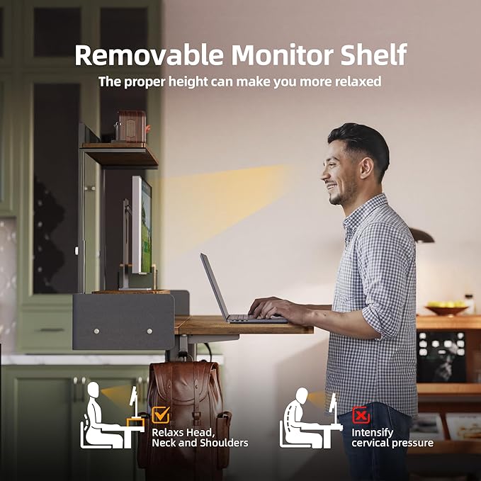 - Spacious & Efficient Space: The electric standing desk with monitor shelves for your monitor and also offers additional storage space for office supplies, maximizes desktop space, and keeps your work area neat and organized