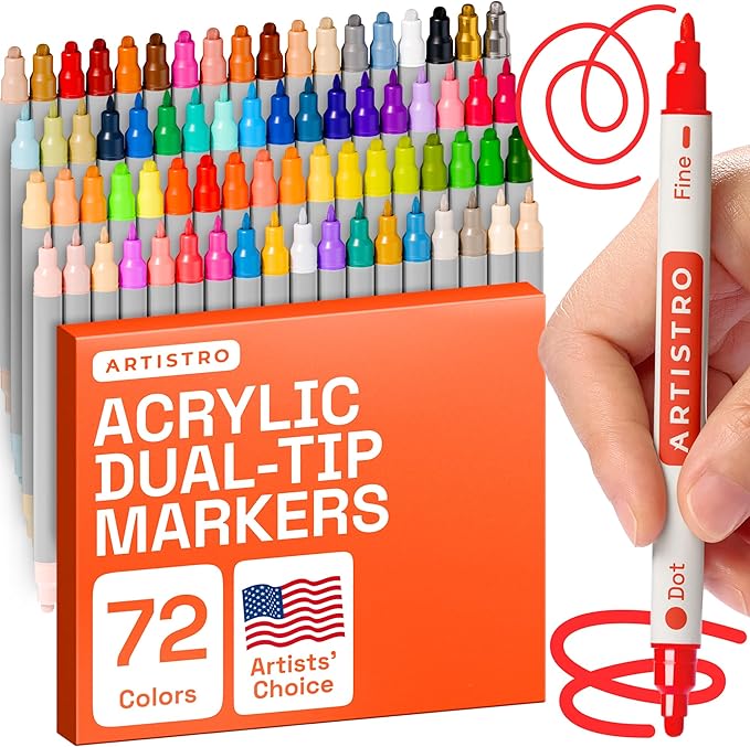 ARTISTRO Vibrant Acrylic Paint Markers for Rock, Fabric, Glass, Wood, Paper, Ceramic, Canvas & More - 72 Dual-Tip Paint Pens (Dot & Fine) - Quick Dry, Teacher Classrooms Must Have, Drawing Markers
