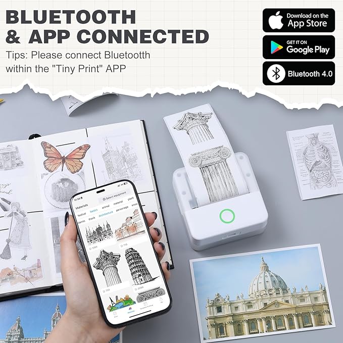 - Compact & Portable Size: Mini thermal printer for phone, elegant, cute appearance, compact and lightweight body size, can be carried in a schoolbag or bag, placed on a desk, office desk, or kitchen without taking up space, you can record study notes or work plans at any time to meet your various printing needs