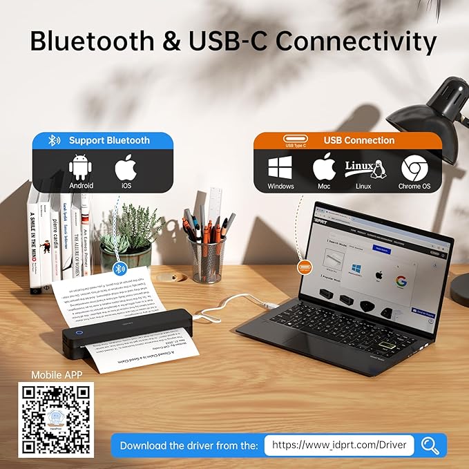 - Universal Device Compatibility: This Bluetooth printer connects seamlessly via Bluetooth or USB. It is compatible with phones (iOS, Android) and laptops (macOS, Windows, Linux, Chrome OS). The "HerePrint" app makes mobile printing effortless (download from the App Store or Google Play)