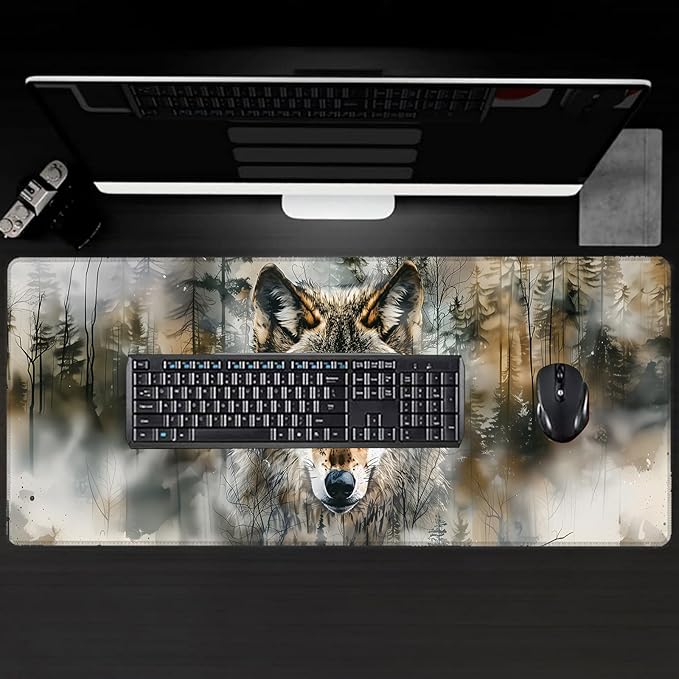 Cool Wolf Large Gaming Desk Mat,Rubber Non-Slip Majestic Forest Mouse Pad,31.5x11.8x0.12in Extended Wildlife Mousepad,Game Lover Mice Pads Gifts,Office Home Deskmat Decor