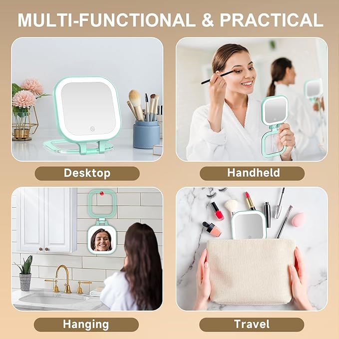 Mocado Compact Travel Makeup Mirror, 1X/20X Magnifying Mirror with Light, Double Sides Compact Mirror with 3 Color Light, Dimmable Handheld Mirror, Rechargeable Travel for Purse,Pocket(Green)