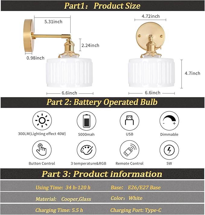 - 【Product size】 Arm length:5.35"(14cm), lamp shade size:6.69"x4.72"(17cmx12cm). Polished brass fittings are not easy to rust, durable, and resistant to oxidation and moisture. Comes with a rechargeable light bulb, the wattage is 3 watts, 150 lumens, 5000 mAh, using a USB C charging cable.