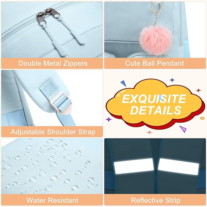 - 【Multi Pocket】: The backpack for school includes 1 main pocket, 2 small inner pockets (for storing small items), as well as a protective compartment for storing files or laptops, 4 external front pockets, 1 hidden zippered back pocket, and 2 side pockets for placing water bottles. This cute middle school girls' backpack features a multi compartment design and comes with a plush ball key pendant as a gift, adding practicality and fashion to it.