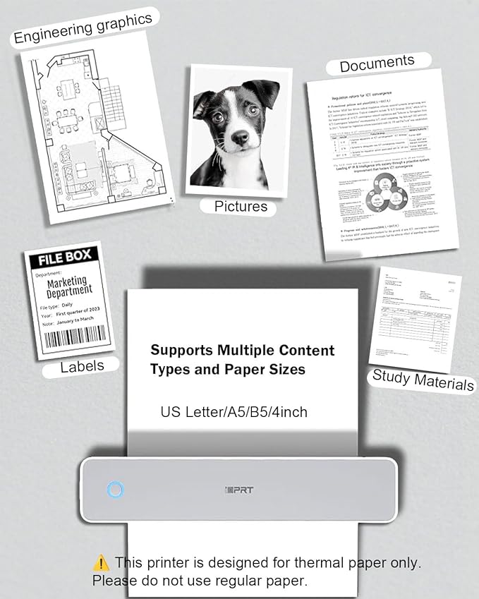 - ✅ Gift Worthy Printer for Work or Study– This compact thermal printer supports US Letter/ A4/ A5/ B5 / 4-inch paper sizes. Print PDFs, notes, receipts, and reports on demand. Ideal for students, digital nomads, field professionals, or anyone needing portable printing—makes a practical and thoughtful gift too.