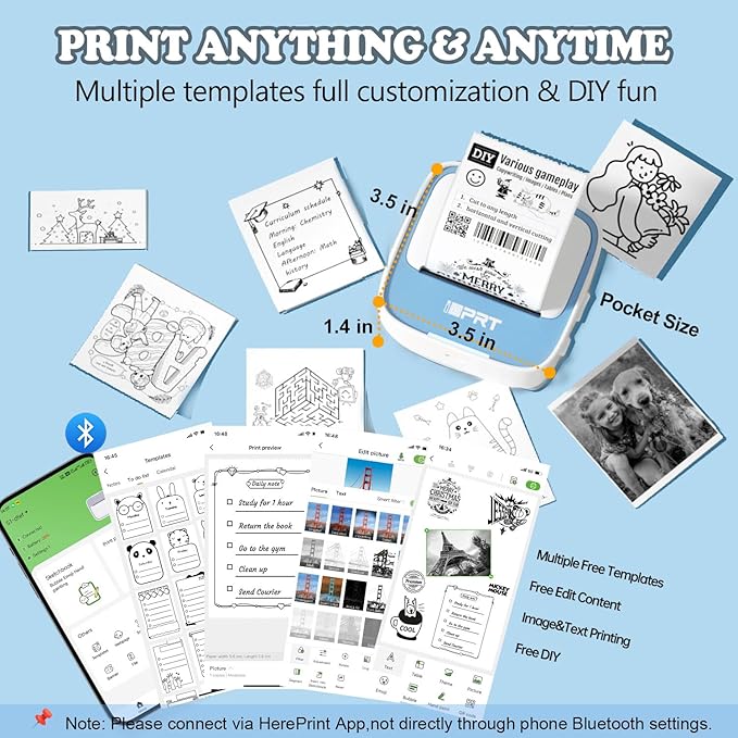 - ✅ POWERFUL APP STICKER MAKER: Use the HerePrint app to access templates, SCAN, PRINT DOCS, and more. This print pods mini sticker printer prints text and photos instantly. Designed for black and white output only. (Note: This device is not a camera.)