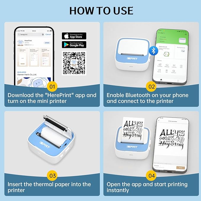 - ✅ BLUETOOTH STICKER PRINTER: Connect the S1 mini inkless printer to your iOS or Android phone via Bluetooth. ① Download the “HerePrint” app → ② Long press the power button until the blue light turns on → ③ Enable Bluetooth on your phone → ④ Open the app, tap “+,” and select “S1” to connect. (Not compatible with computers.)
