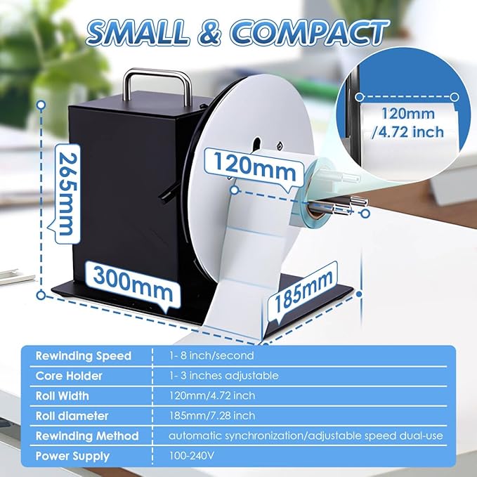 - BI-DIRECTIONAL REWIND: The Label Rewinding machine can realize bi-directional rotation either forward or backward to meet your different label rewinding needs.And the maximum rewind label roll diameter can reach 7.28inches(185mm) and the width can reach 4.72 inches(120mm)