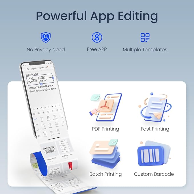 - Fast & Stable Connection: Portable thermal label printer built -in 1500mAh large capacity battery can print 4 hours continuously after fully charged. Mini label printer only 240 grams and speed up to 55mm/sec. High speed brings high efficiency and helps your business grow faster!The wireless printer supports iOS, Android and window. Fast and stable connection. Not suggested for use with Pad, incompatible with Pad.