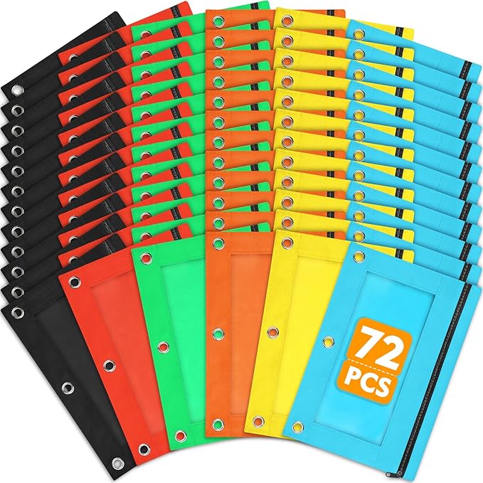 72 PCS Pencil Pouch for 3 Ring Binder, Zipper Pencil Pouch in 6 Colors, Durable 3 Ring Pencil Pouch with Clear Window, Binder Pencil Pouch Bulk for Classroom Office School Supplies