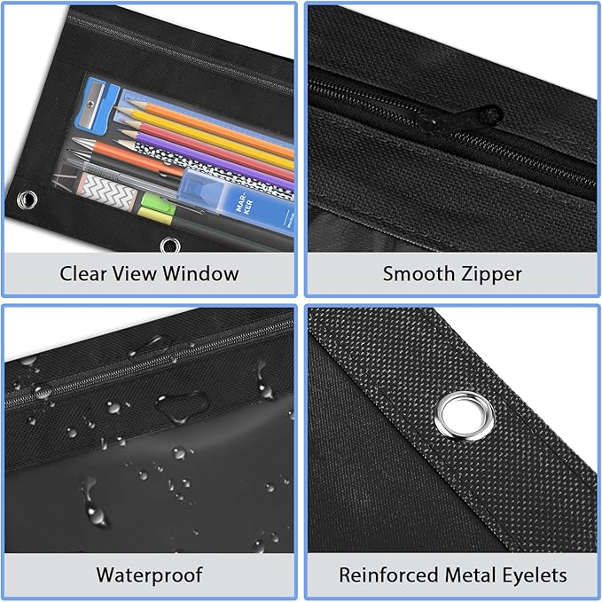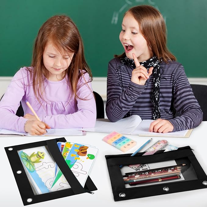 Ochido Pencil Pouch for 3 Ring Binder Bulk, 30 Pack in Black, Sturdy and Durable 3-Hole Binder Cloth Pencil Bag, Zipper Pencil Case with Clear Window for Storing School Office Supplies