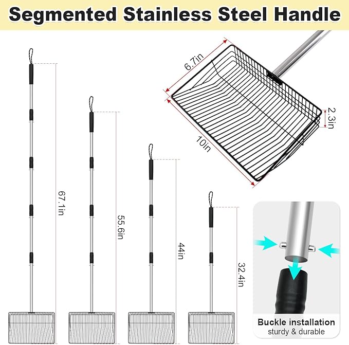 - Adjustable Stainless Steel Handle: The coop scoop features an adjustable stainless steel handle(32" 44" 55" 67"), allowing you to customize the length for people of different heights/situations. The chicken poop scooper head made with iron wire and 201 stainless steel handle, metal ensures durability, making this metal chicken coop scoop a long-lasting tool for daily coop maintenance.