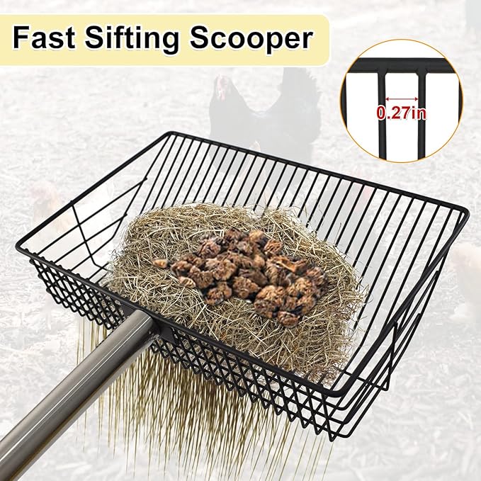 - Multi-funtion Sifting Shovel: More than just a chicken scooper for poop, this versatile coop scoop also works as cleaning chicken litter, horse apples, dog piles, clean out sandbox and shoveling hay and straw. The easy installation requires no tools—simply attach the handle and start cleaning!