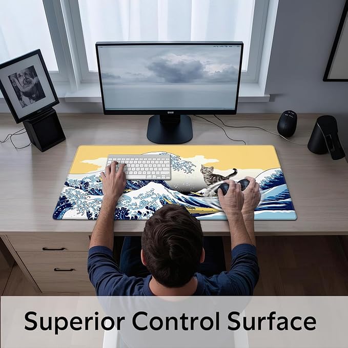 Funny Cat Surfing The Great Wave Off Kanagawa Mouse Pad - Large Non-Slip Desk Mat for Office, PC, Laptop - 35.5"x15.7" x 3mm