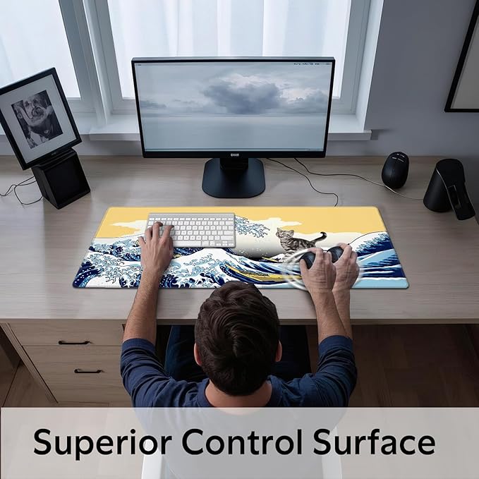 Funny Cat Surfing The Great Wave Off Kanagawa Mouse Pad - Large Non-Slip Desk Mat for Office, PC, Laptop - 31.5"x11.8" x 3mm