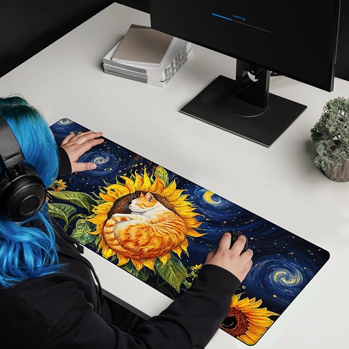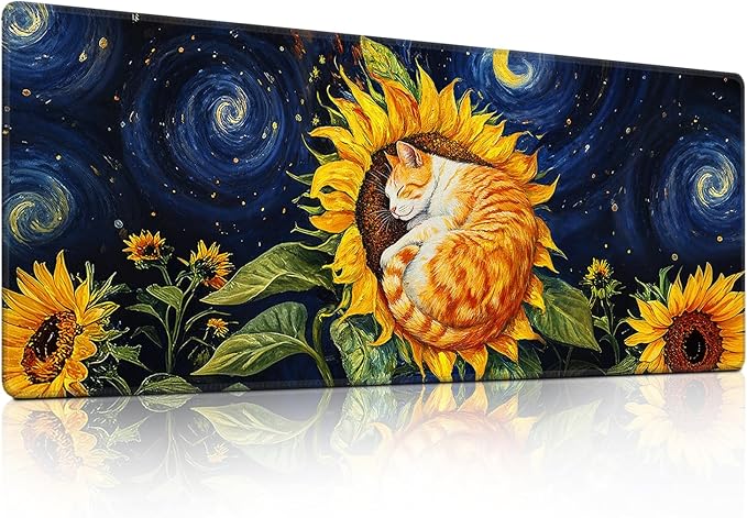 Sunflower Cat Gaming Mouse Pad, Starry Sky Cute Orange Cat Mousepad - Large Non-Slip Desk Mat for Office, PC, Laptop - 31.5"x11.8" x 3mm
