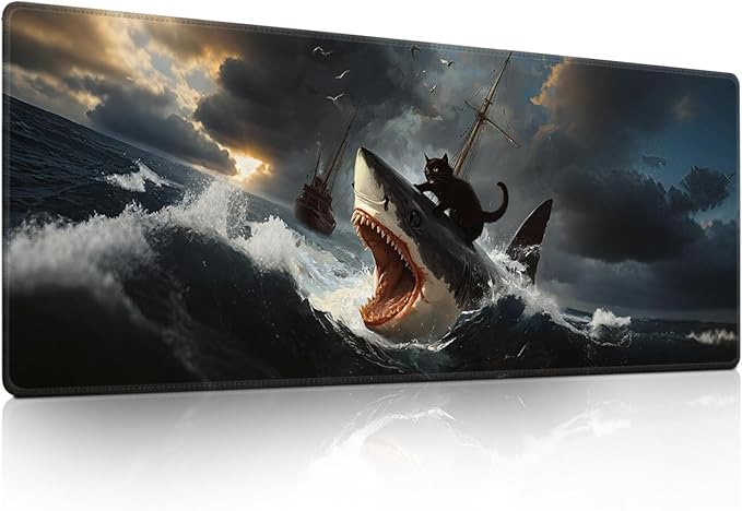 Funny Black Cat Mouse Pad, Abstract Quirky Cat and Shark Mousepad - Large Non-Slip Desk Mat for Office, PC & Laptop - 31.5"x11.8" x 3mm