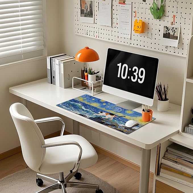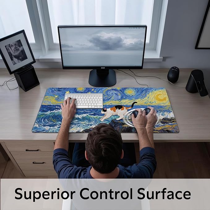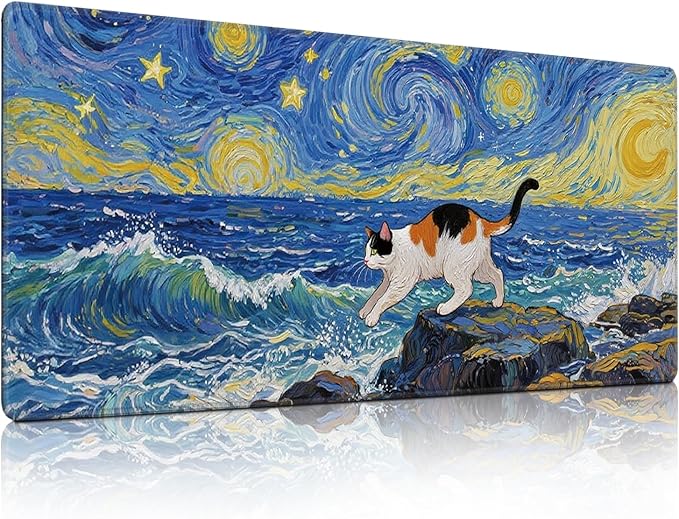 Cute Calico Cat Surfing Mouse Pad, Starry Night Style Mousepad - Large Non-Slip Desk Mat for Office, PC, Laptop - 35.5"x15.7" x 3mm