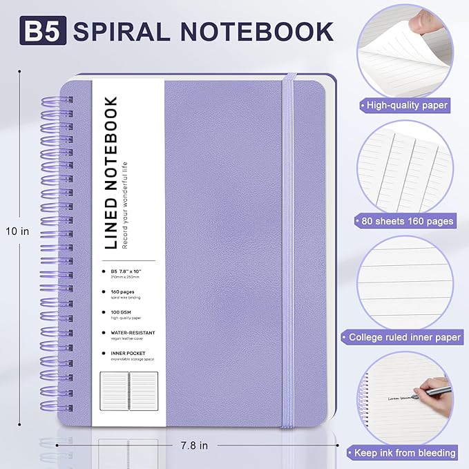 - Hardcover Leather Spiral Notebook Lined Journal: Our spiral notebook features a sturdy and water-proof vegan leather cover, which protects interior pages while traveling and for daily use. This medium 7.8 x 10 inches B5 lined spiral journal with smooth touch and succinct appearance, gives you a good writing experience and visual enjoyment. Great spiral journaling notebooks, perfect as writing, studying, meeting, or college notebooks, giving your life a greater sense of order and purpose.