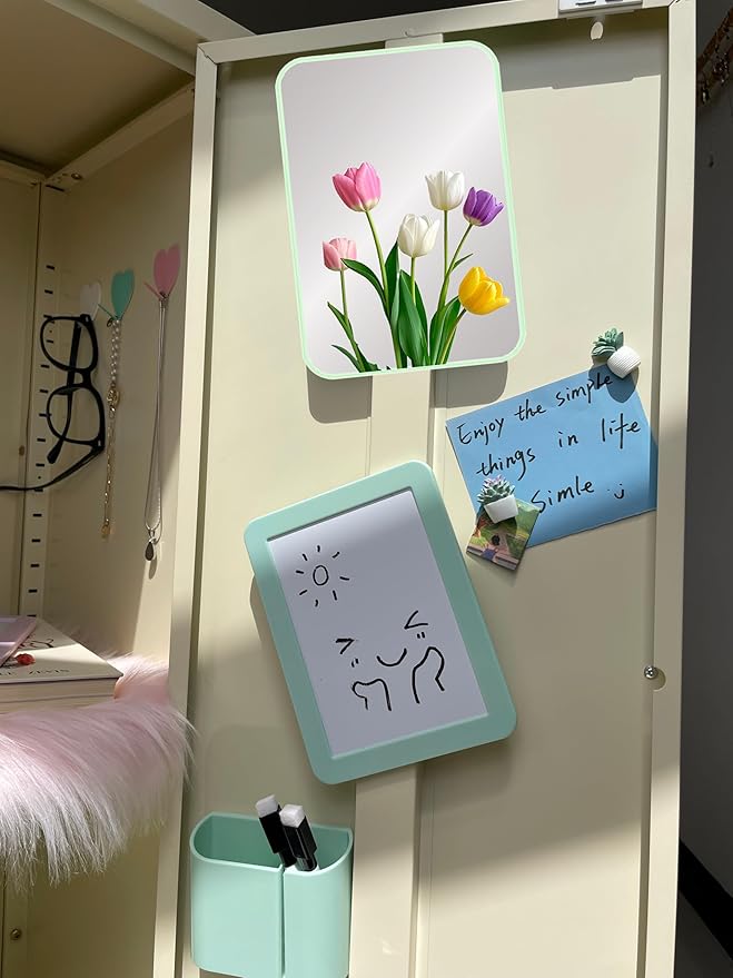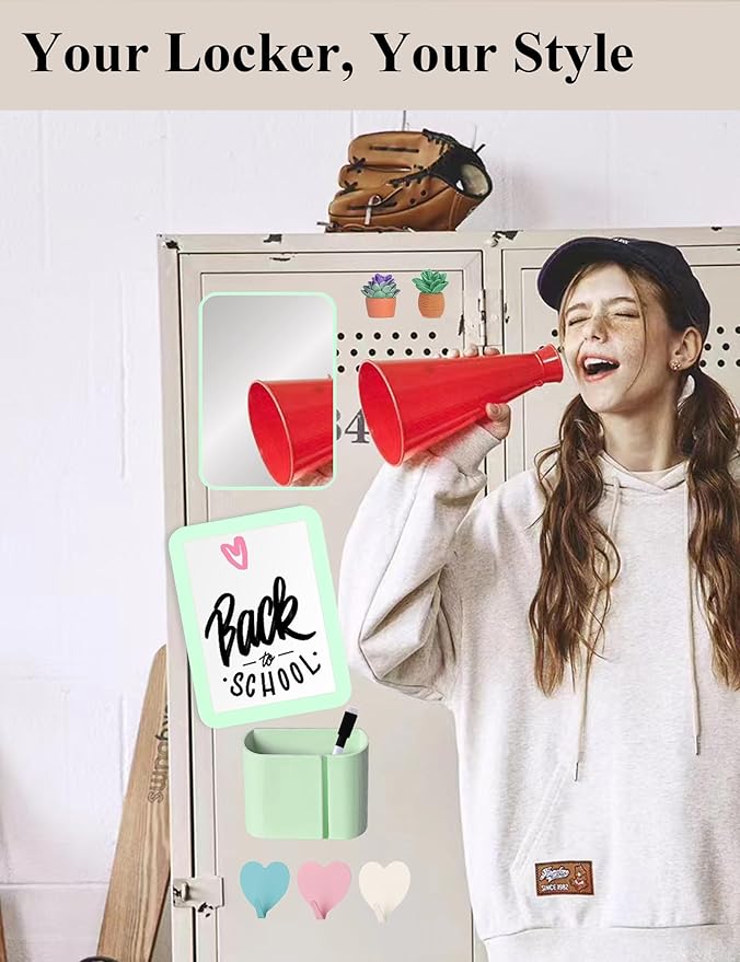 - 【Locker Accessories Kit】 This 12 piece locker organizer has everthing you need to orgnize, decorate, and refresh your locker. This handy combo inclueds 1 magnetic mirror-check your look anytime, 1 magnetic whiteboard + 2 dry erase markers-Jot down notes & reminders in seconds , 1 magnetic pen holder-Keep pens & small items neatly stored, 1 locker rug-locker decoration, 3 colorful hooks-perfect for hanging keys, hats, towels, purses, and other lightweight items, 1 mini storage basket-Compact and portable, they provide an efficient and organized storage solution, and 2 cute magnets-Adorable way to display photos & memos.