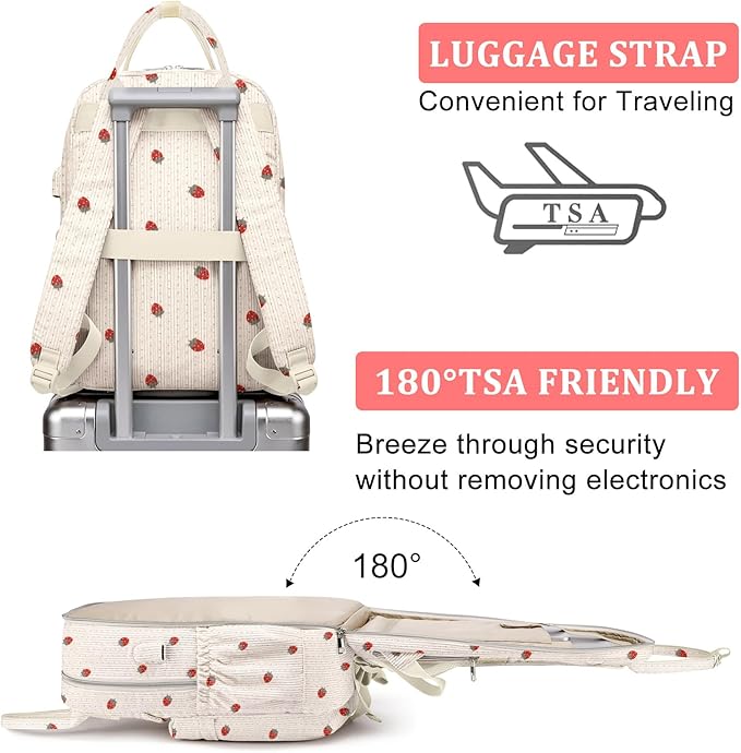 School Backpack for Girls Laptop Bookbag: Casual Corduroy Women Backpacks with USB Charging Port TSA Friendly Travel Back Pack with Anti-Theft Pockets Cute College Daypack for Teen Students Strawberry