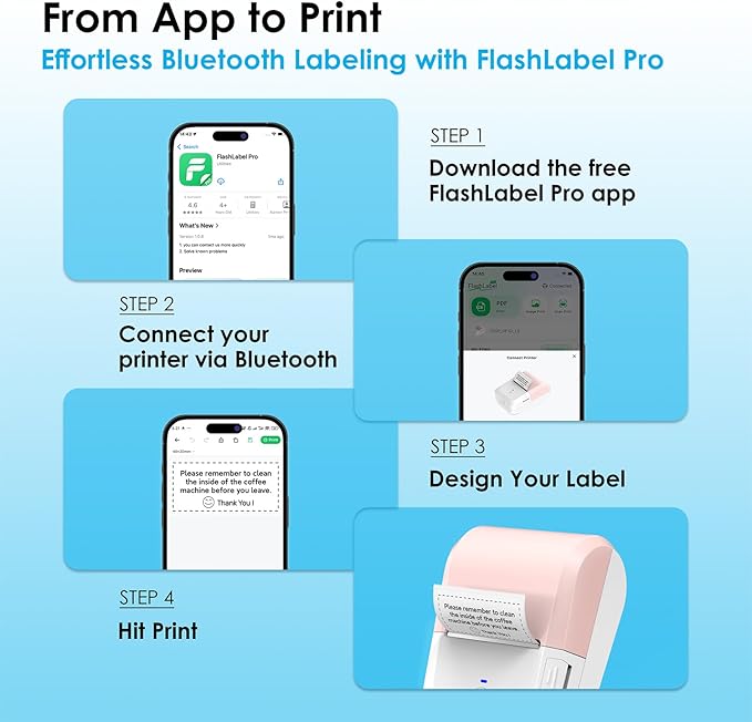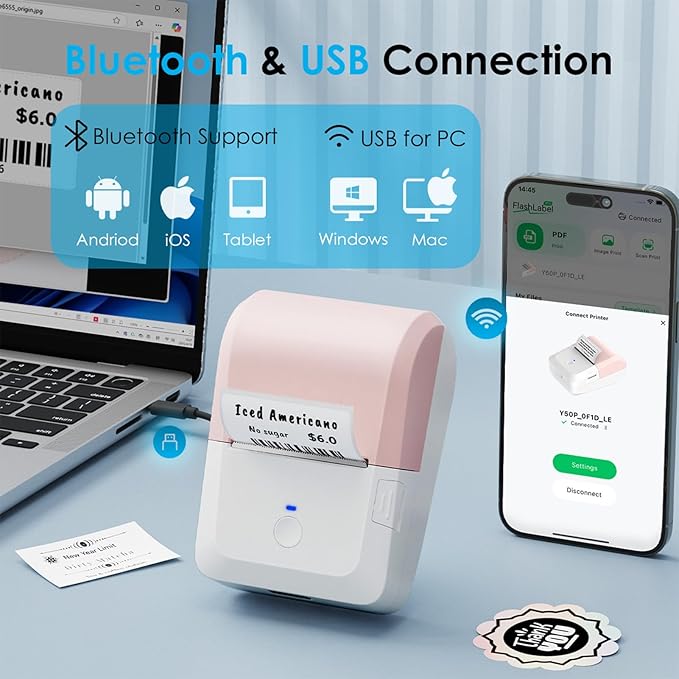 - Bluetooth Wireless Printing Made Easy: KNAON Portable Thermal Label Printer supports Bluetooth connectivity, enabling smooth wireless printing from your smartphone, tablet, or laptop. To get started, for iOS and Android users, simply download the ‘FlashLabel Pro’ app from the Apple App Store or Google Play Store. Please note: Devices must connect through the ‘FlashLabel Pro’ app — direct Bluetooth pairing is not supported.