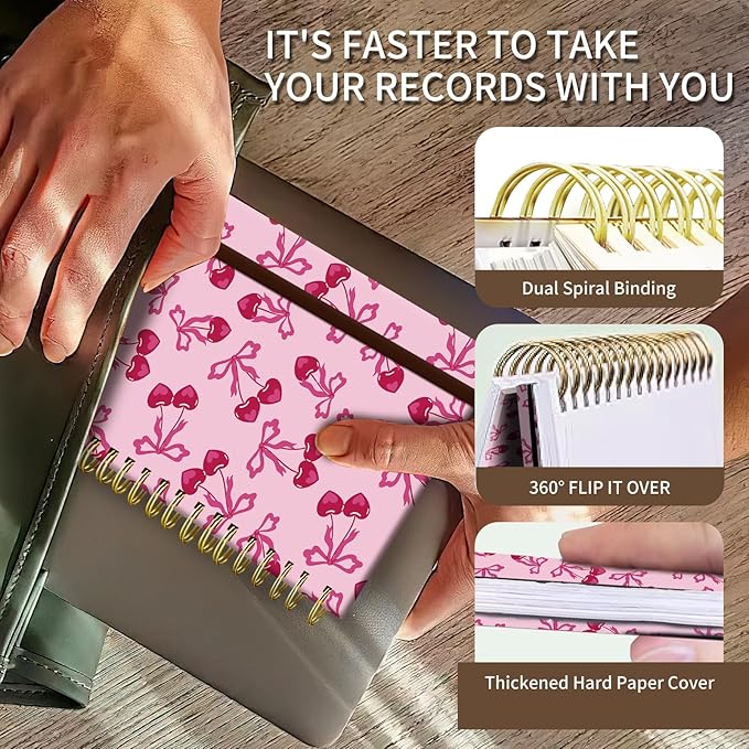 Bansutay Spiral Journal Notebook, A5 Cute Notebooks for Women Men, College Ruled Hardcover Notebook for Work & Note Taking, 60 Pages Double-Wire Journals for Writing (Cute Pink Cherry Bow)