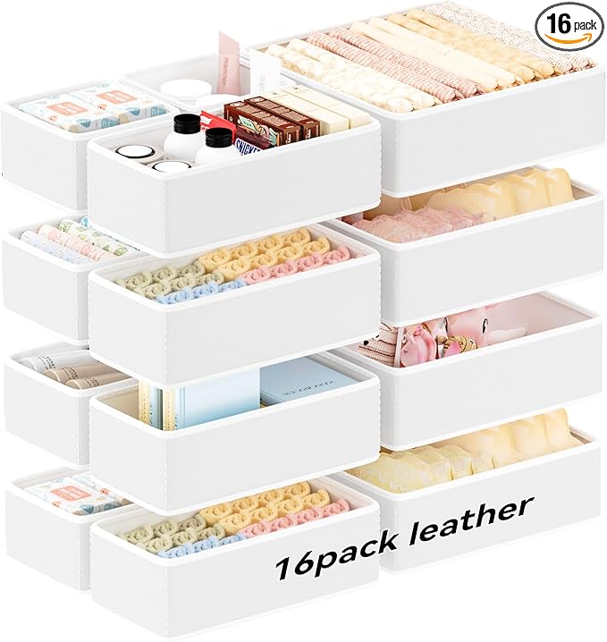 Vegan Leather Drawer Organizers,16 Pack Makeup Storage boxes,Vanity Drawer Luxury upgrade,Bedroom fabric Drawers replacement,bathroom organization and storage Optimal solution
