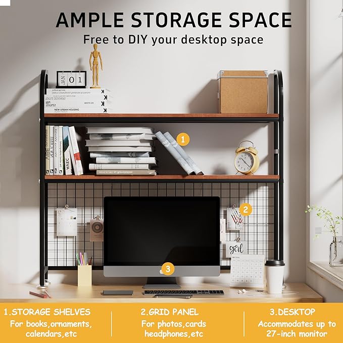 - 【Built to Last】Constructed with high-quality particleboard and metal frame, our desk shelves are designed for durability. The combination of heavy-duty wood and a matte metal finish enhances the stability and longevity of the desk hutch organizer. Additionally, four anti-skid feet safeguard your desk surface from scratches and scuffs.