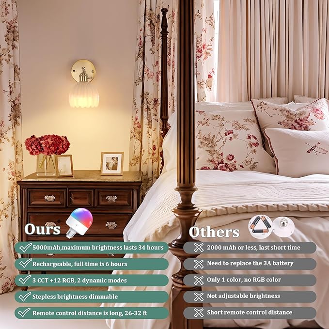 - 【Rechargeable Bulb】Our battery operated wall sconces have a large lighting range without dim places, high brightness, can adjust four color temperatures (3000K/4000K/6500K) and 9 RGB colors, and can also adjust brightness and timing. Ideal for different scenarios in the home. Tips: The life of the bulb is 2 years.