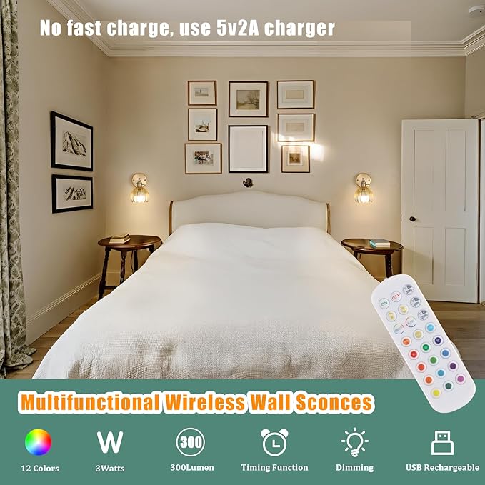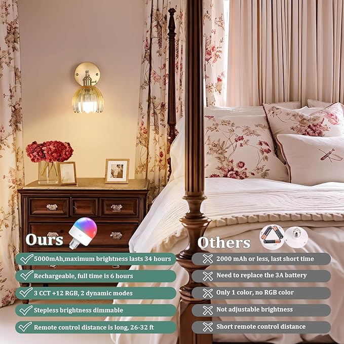 - 【Rechargeable Bulb】Our battery operated wall sconces have a large lighting range without dim places, high brightness, can adjust four color temperatures (3000K/4000K/6500K) and 9 RGB colors, and can also adjust brightness and timing. Ideal for different scenarios in the home. Tips: The life of the bulb is 2 years.