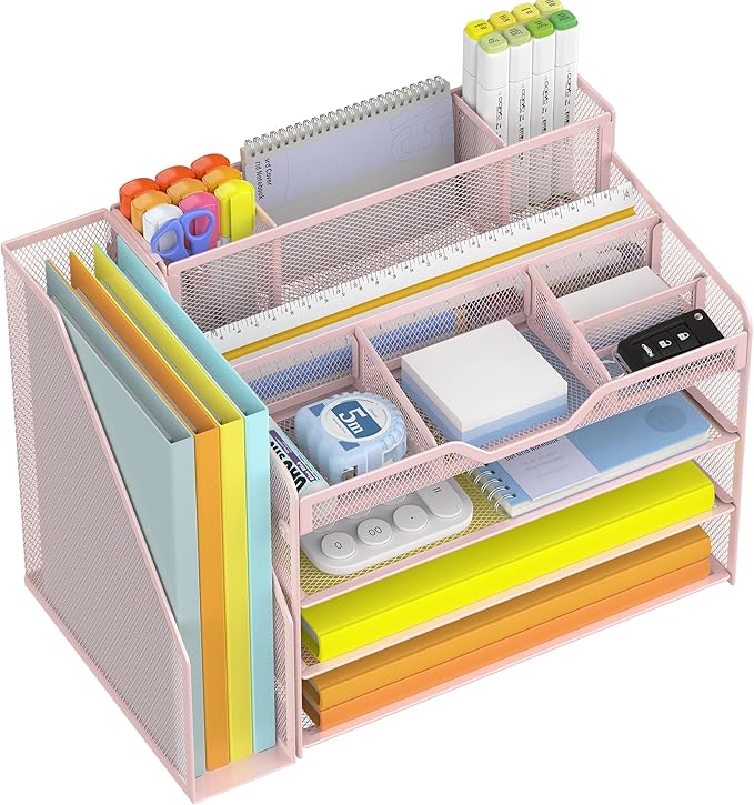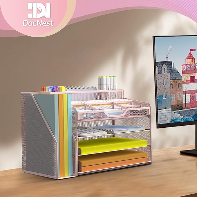 Docnest 4 Tier Mesh Desk Organizer with File Holder – Multi-Functional Paper Letter Tray with 5 Adjustable Compartments, 3 Pen Holders, Desktop Storage for Files, Mail, Stationery – Pink