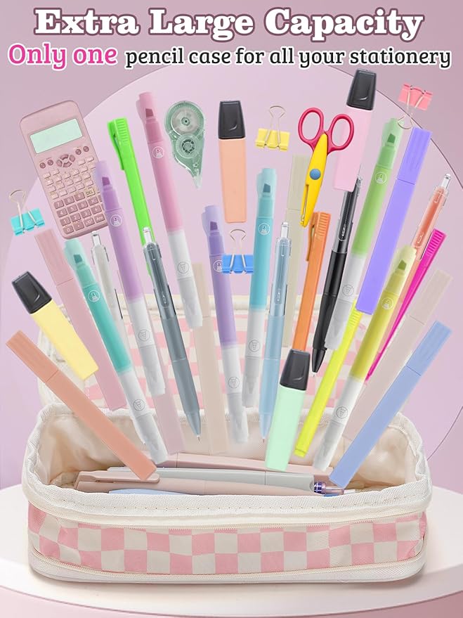 Large Capacity Pencil Case for Teens Girls - Cute Checkerboard Pencil Pouch with Zipper, Stationery Bag Box for Student Back to School Gifts, Pink