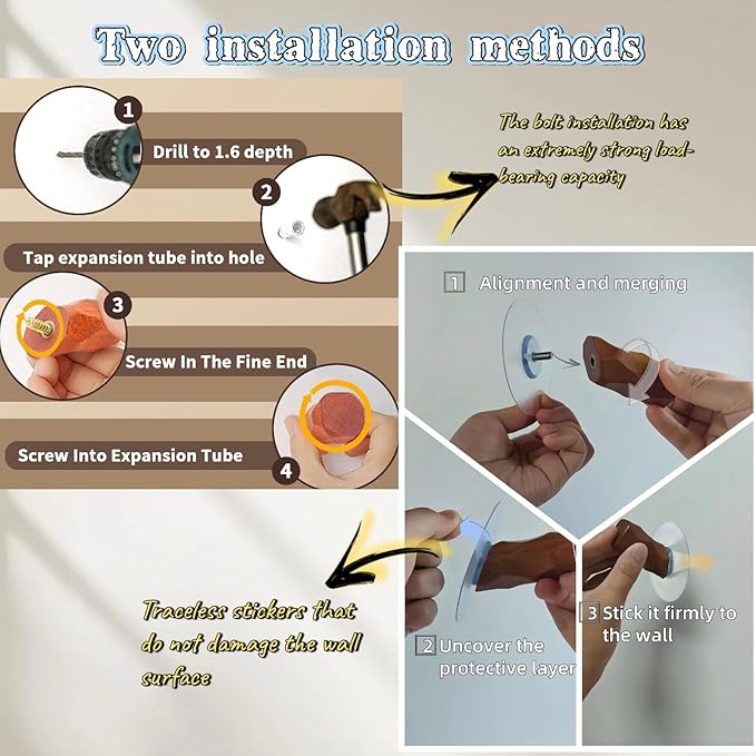 - Easy installation process: Even beginners can easily mount the hat hooks onto wall hooks. Two installation methods are available: screw mounting and damage-free adhesive mounting. Package includes: 4 wooden hooks 2 drill bits 4 sets of screws 4 damage-free adhesive strips