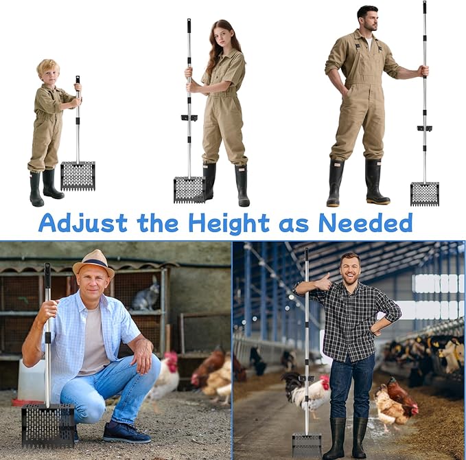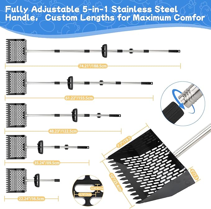 - Adjusts to 5 Different Lengths: The handle can be adjusted to 5 lengths by adding or removing sections to suit any size person- 22.24"/56.5cm, 35.24"/89.5cm, 48.23"/122.5cm, 61.22"/155.5cm, 74.21"/188.5cm; It means you can make the chicken rake shorter for tight spaces or extend it when you are working standing up, reduces the need to keep bending crouching or squatting down; Save your back or knees!