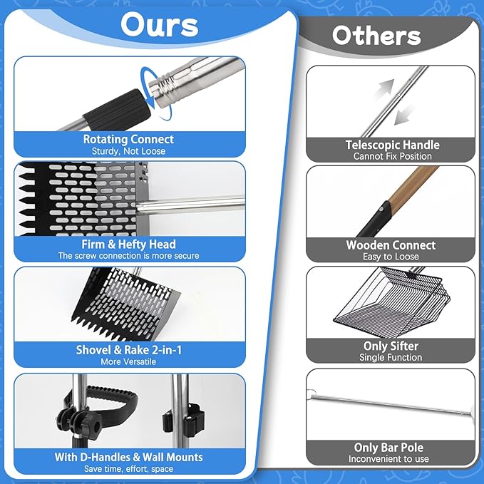 - Solid and Hefty: This goat pooper scooper is not some flimsy thing, does not bend no matter how heavy the substrate is; The shovel head is well made with heavy hard metal, no breaking even when scraping dried droppings off wooden roosts or rough surfaces, also holds up well even with damp litter or heavier clumps; Pole made with sturdy 304 stainless steel, it's designed for durability and won’t bend like plastic