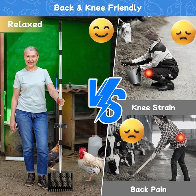 - Universal Tool: This multi-purpose horse poop scooper is known as a"do-it-all tool" to eliminate the need for additional tools that perform similar tasks; It is not only use in chicken coops (hemp/straw/sawdust bedding), but also sand filled farm goat stall, horse stable, cow shed ,rabbit pen, dog piles, hoggery or garden; Extra use: loosen soil, compost piles, gather legunes, shovel leaf, beach fun, separate stone.etc