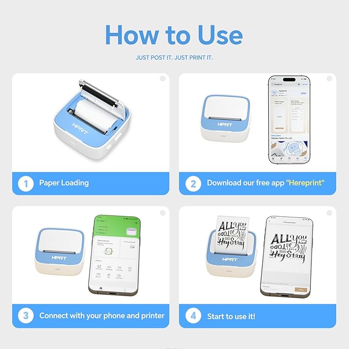 HPRT Mini Printer Sticker Maker with 1 Rolls Paper, Bluetooth Portable Thermal Printer, Study Printer for Pictures, Study Notes, Kid's DIY Creation, Memo, List,Compatible with Phone, Blue