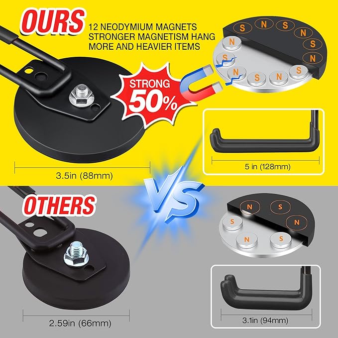 - 🧲[Super Durablel] This heavy duty magnetic holder boasts a magnetic diameter of 3.5in(88mm) and features 12 powerful neodymium magnets. The base of the magnet hook is cover with premium soft rubber, providing excellent friction and protect surface from scratches, reduce wear, and make them durable