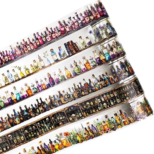 - Whimsical Potion Designs: 6 rolls of fantasy-themed PET tapes, each measuring 1.57in x 78.74in, showcase mystical potion bottles with floral, celestial, and gothic cabinet styles, adding enchantment and charm to any paper project