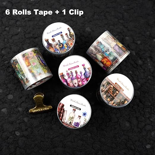 6 Rolls Witch Potion Bottle PET Tape Set with Clip, Waterproof Gothic Scrapbook Sticker Rolls for Journaling, Bullet Journals, and Dark Aesthetic Crafting